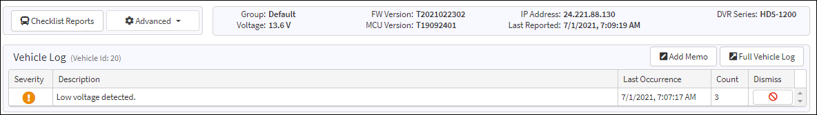 Duplicate memo entries are consolidated to avoid repetitious memo entries. The number of duplicate memo entries is denoted in the Issue Count column associated with the entered memo. For example, if a memo is entered stating a Low temperature is detected, the description would not be repeated in the table, but added to the Issue Count as a second occurrence of the issue as shown in the second to last row on the Vehicle Log sample above.