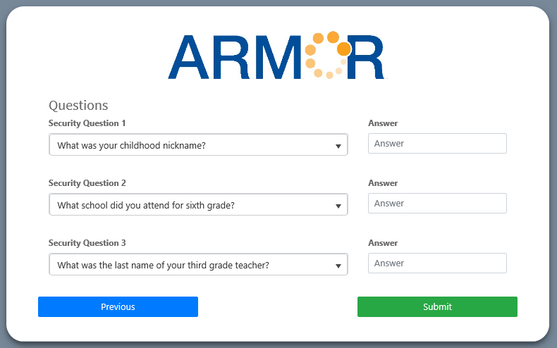 In the Questions window, select and answer three Security questions from the drop-down list for each question.  Click Submit.