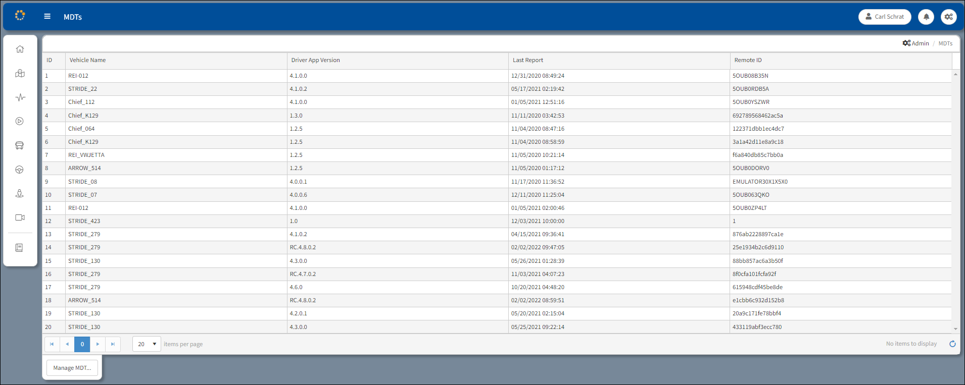 This display only window allows administrators to track activity of various Mobile Data Terminal (MDT) devices across the fleet.