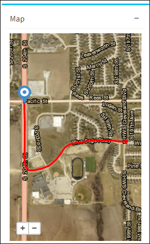 Shows the current location of the vehicle when the stop arm video was recorded. The view can be zoomed in and out using the +/ - buttons on the map display. The movement of the vehicle icon on the map