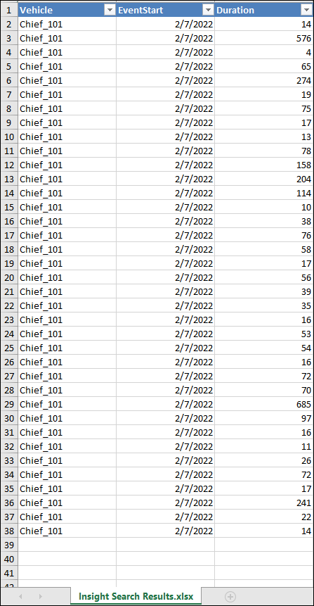 An Insight Event Search can be utilized to locate specific inputs and events for a group of vehicles or a specific driver vehicle over a multiple number of days. The functionality allows custom searches to suit user criteria.