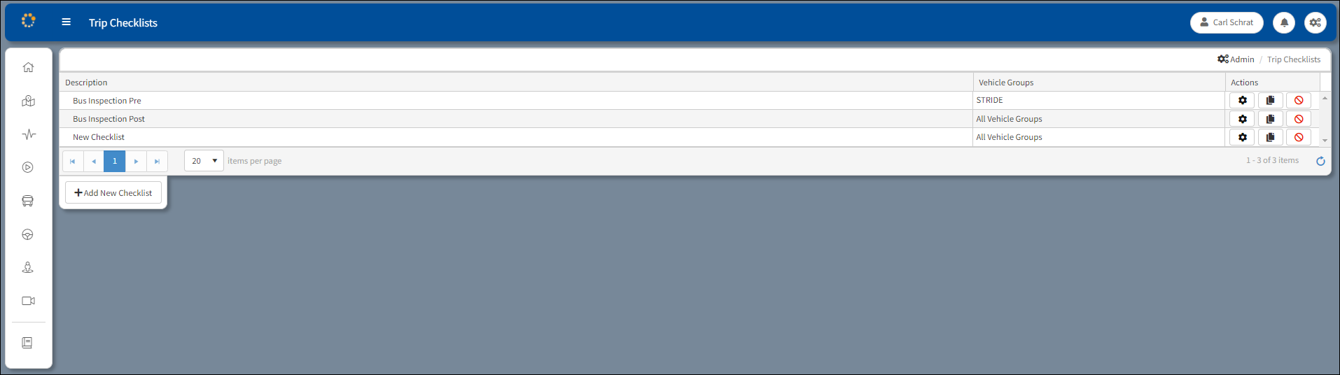 The Trip Checklist that is selected to apply to the specified vehicle group is individually listed on the main Trip Checklist window.