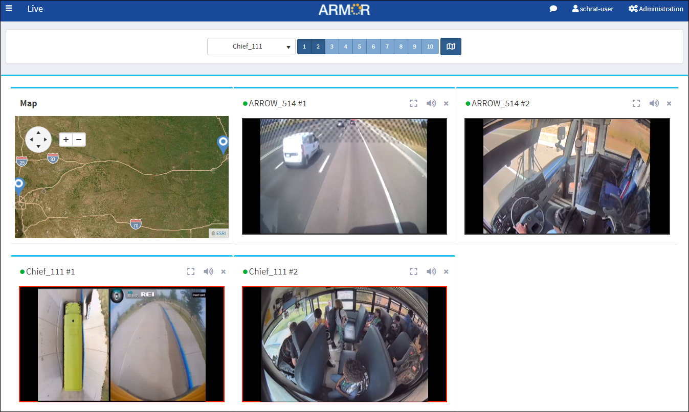 From the Live window use the Vehicle: drop-down to select a vehicle (i.e.,Chief_137). Select channels from the numbered bar next to the Vehicle: drop-down. The map can be opened by clicking the Map