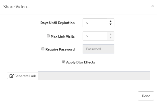 A video can be shared with its blur effects maintained by clicking the Apply Blur Effects check box. Click Generate Link to create the URL for the video link. Click Done when finished.